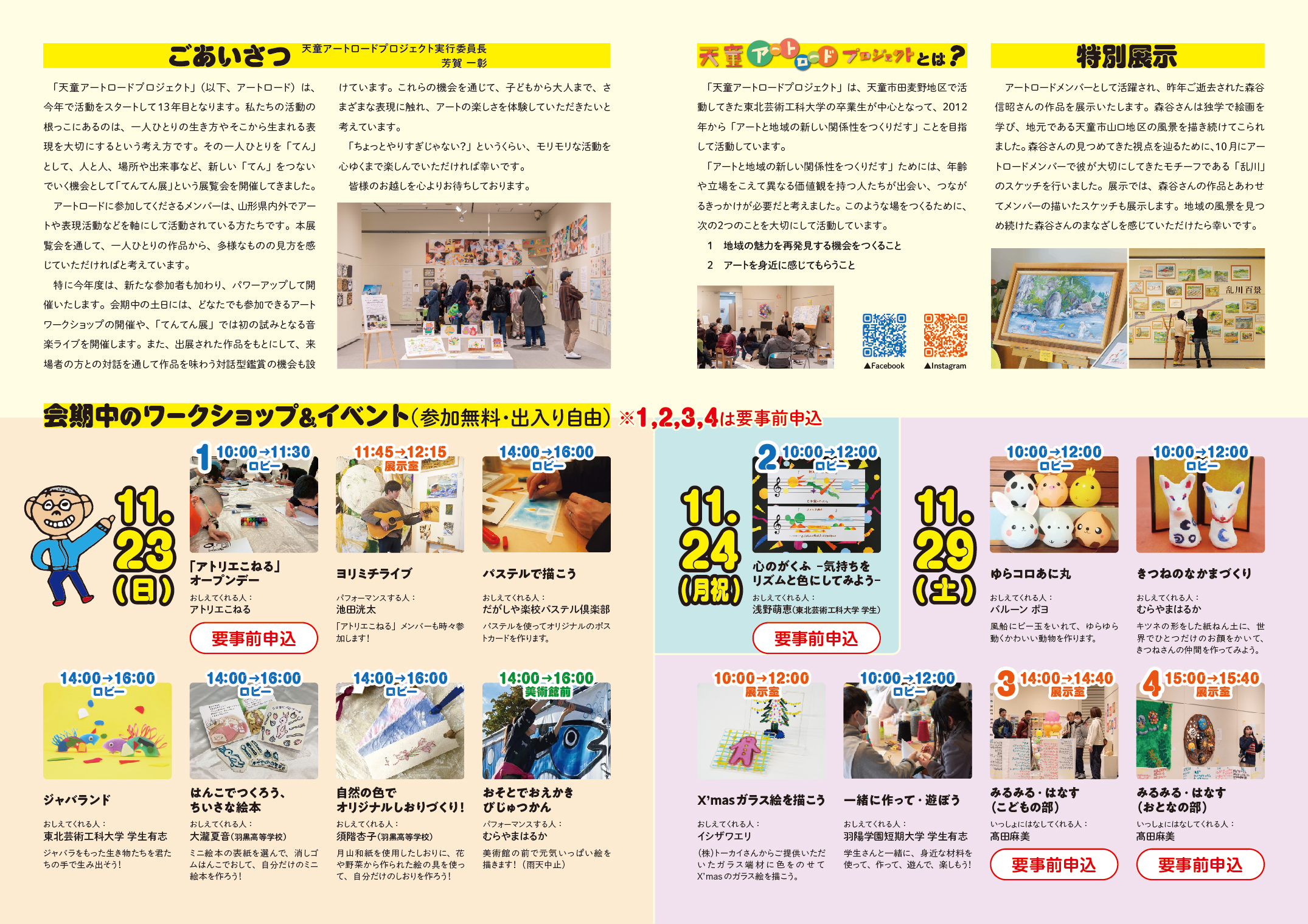 天童アートロードメンバーと天童市内で活動する方の作品を展示し、作品鑑賞やワークショップを通して様々な表現にふれ、アートの楽しさを体験できる内容となっています。